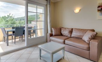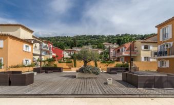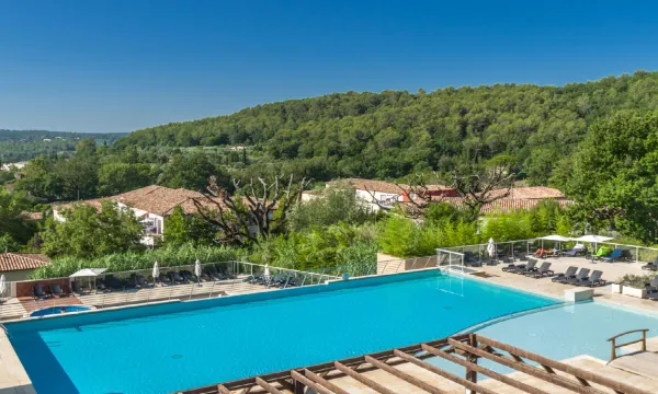 Resort "Domaine de Camiole", 3 storeys. 18 houses in the residence. 183 apartments in the residence. 1 km from the centre of Callian, on the outskirts, 25 km from the centre of Grasse, 32 km from the centre of Mandelieu, 32 km from the sea, 8 km from the lake. For shared use: property 70'000 m2, trees, swimming pool (seasonal availability: 01.May. - 31.Oct.). Table tennis, boccia. In the complex: table tennis, washing machine, tumble dryer (for shared use, extra). Parking. Shop 1 km, bus stop 1.2 km, sandy beach 32 km. Please note: entertainment in the season. The photograph shows a typical example. The holiday properties may differ in living space, floorplan, equipment and furnishing. "Domaine de Camiole", 3-room apartment 46 m2. Tasteful furnishings: living/sleeping room with 1 double sofabed, dining table and satellite TV. 1 room with 1 french bed. 1 room with 2 sleeping facilities. Open kitchen (oven, dishwasher, 4 ceramic glass hob hotplates, microwave, electric coffee machine). Sep. WC, bath or shower. Heating, air-conditioning. Balcony. Balcony furniture. Facilities: Internet (WiFi, free). Please note: non-smokers only. Maximum 1 pet/ dog allowed. Smoke alarm, fire extinguisher.