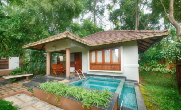 Location & Environment: The hotel is nestled in a serene cardamom plantation, offering a tranquil, nature-immersed setting with a stream, waterfall, and lush greenery. The architecture harmonizes with the surroundings, creating a mystical, peaceful atmosphere.