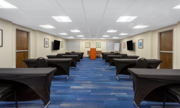 Guests can start their day with our complimentary Express Start Breakfast Buffet, offering a delicious mix of hot and cold options, including our signature pancakes.For those visiting on business, the hotel provides a 1,160 square foot meeting space equipped with four 65 inch TVs, perfect for presentations and small gatherings.