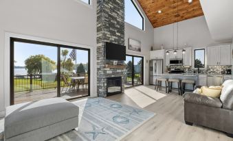 Enjoy the beautiful views and sunsets from the large deck or patio! Outdoor fire pit, chairs, lounge chairs, picnic table and more! Cottage has 2 full kitchens and 2 fireplaces, outdoor shower and bar area! Nice tile walk in shower and tub for your kids. Swing set and games on site.