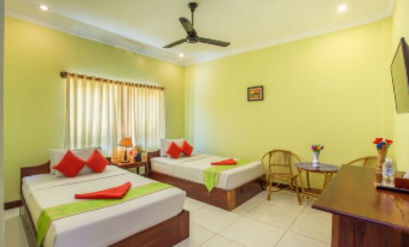 Excellent breakfast included in the price. The hotel is great value for money and has a pool. The rooms are very spacious and comfortable. The staff were extremely pleasant: we had a problem with the van taking us to our bus and they sorted it out for us. Highly recommended for a 2-3 day stay in Siem Reap.