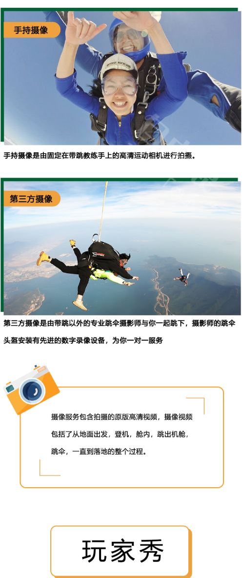 10. For safety reasons, UPSA does not allow any photography or videography equipment during skydiving activities for individuals with fewer than 200 jumps. However, you may take photos on the ground before boarding. Our basic package inclusions feature handheld video recording. For more spectacular footage, you may consider purchasing third-party filming upgrade services.