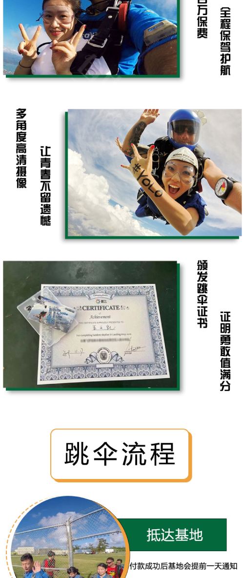 6. Please arrive at the skydiving base on time as scheduled, and check in at the front desk with your valid ID (ID card, passport, or military officer certificate).